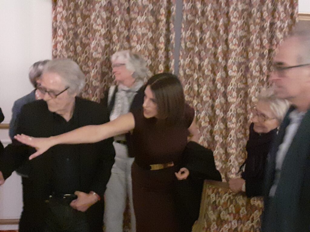 Etienne Mallet, Président des Amis du Musée de la Toile de Jouy, s’est intéressé de près à ce travail, admiratif à la fois de l’artiste et de la chef d’entreprise, puisqu’elle a créé la maison d’édition Petit Saturnin qui édite ses BD. Éclectique dans les procédés (sérigraphie, linogravure…), les supports (carrés imprimés, vêtements…) qu’elle choisit, il y a bien une « patte » graphique » Audrey Sedano, à la croisée des recherches sur le patrimoine, de l’humour et de l’art contemporain. Boulimique de travail et en perpétuel besoin de renouvellement, on a pu l’entendre dire : « Je suis devenue spécialiste du travail sur carton », à l’occasion de la confection d’une robe en complicité avec Sylvie Bonsom, sa mère, qui co-signe trois « pièces de mode ». Les plumes de la robe bustier bleue (photo) à dessins blancs sont un clin d’œil au personnage du chevalier-canard dans la BD Saint Sat’.