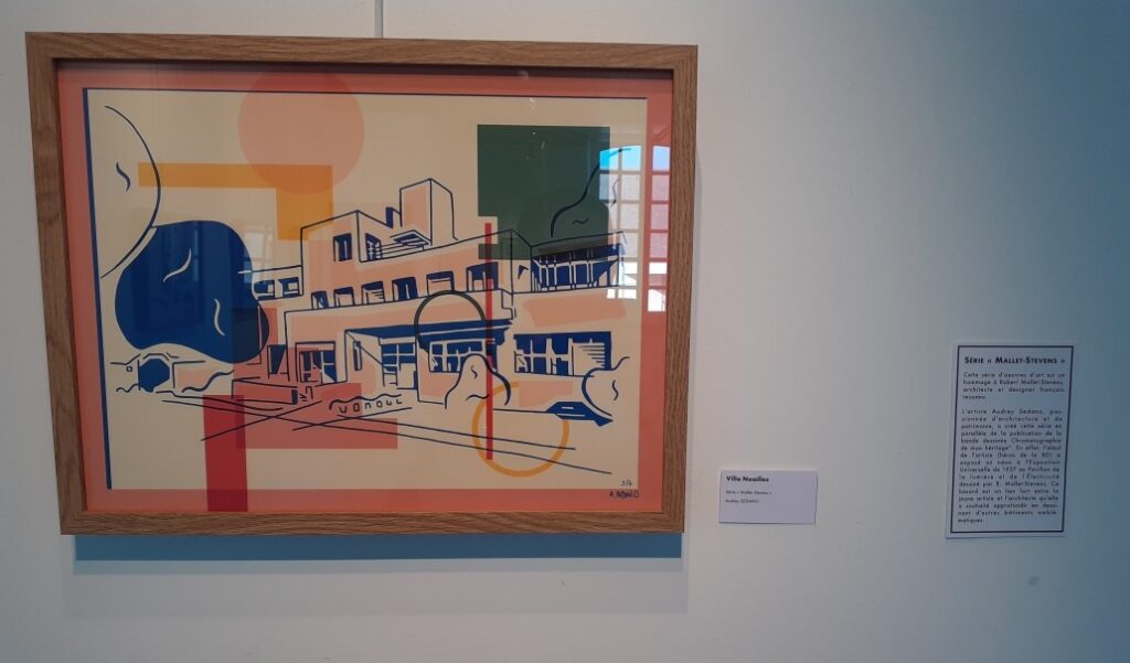 Sur l’affiche, une des héroïnes dessinées par l’artiste : Lysa, une biologiste qui utilise l’IA pour prédire des protéines et doute (« dois-je mener mes recherches à l’ancienne ? »). Audrey Sedano transposée ? N’est-elle pas docteur en bio-informatique ? A moins que l’artiste se soit représentée à travers l’autre héroïne, Sally, une illustratrice qui crée l’affiche d’un Festival du film ? Dans Chromatographie de mon héritage, Audrey Sedano a mis à l’honneur un aïeul, Marcel Servigne, scientifique de haut niveau. La série des hommages se poursuit avec celui consacré à l’architecte Mallet-Stevens. Si l’artiste illustratrice s’intéresse au passé (de nombreux pavillons de l’Exposition universelle 1937 sont réinterprétés, comme cet étonnant pavillon du Tabac et des Allumettes), tout particulièrement au patrimoine, son propos fait dialoguer passé et présent.