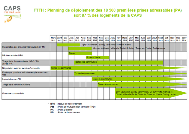 Voici le planning de déploiement, il indique que normalement, les particuliers du Saclay Val d’Albian pourront commencer à souscrire à des lignes fibres optiques FTTH à partir de Février 2013.