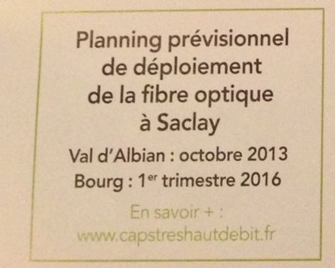 Alors que l’on avait lu à certain endroit que la fibre devrait être disponible à partir de février 2013 (dans une semaine), on apprend dans le dernier numéro du Saclaysien que la fibre n’arriverait finalement qu’en octobre 2013 (dans 8 mois) au val et 2016 au bourg !