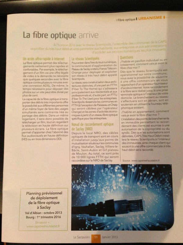 Un an après le résultat de la procédure de la DSP (délégation de service public), le déploiement de la fibre sur la communauté d’agglomération est entré dans sa phase opérationnelle. François Lamy, Président de la CAPS et député maire de Palaiseau, Jean-Paul Huchon Président du Conseil Régional d’Ile de France, et Stéphane Richard, Président directeur général de France Télécom-Orange annoncent la couverture à 100%en Fibre optique des 10 communes de l’agglomération du plateau de Saclay. Ce déploiement est réalisé d’une part dans le cadre du plan AMII et sur les fonds propres d’Orange pour les communes de Palaiseau et d’Orsay et d’autre part dans le cadre de la DSP pour les huit autres villes de l’agglomération.